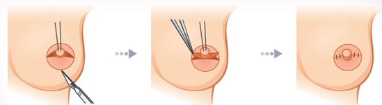1. 局部麻木乳头周围,再切开乳头两边约3mm。