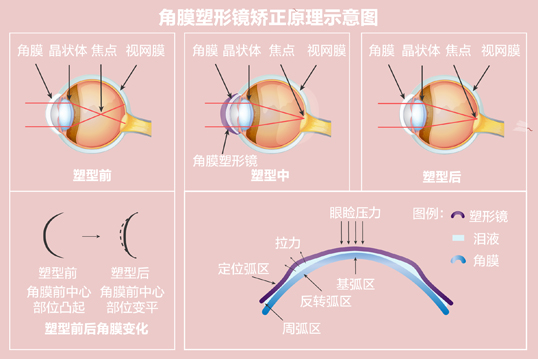 通过机械性压迫,镜片移动的按摩,以及眼泪的液压等物理作用,达到压平角膜中央的形状,暂时减低近视度数的作用