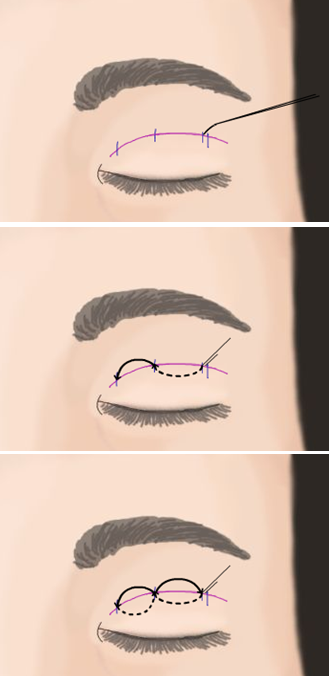 不切开皮肤,仅用双眼皮线固定,埋线法双眼皮做出的是无法看出手术与否的自然双眼皮。打2-4个贯通眼皮的孔口,将线从皮肤到结膜埋入后,再从其他孔口出来打结,这样反复的做,可营造双眼皮。手术时间短,术后2-3日左右一定程度消肿,可以看出自然的模样,因此,非常适合工作中的女性或没有太多富余时间的人。但不适合脂肪或肌肉多的眼睛。